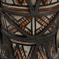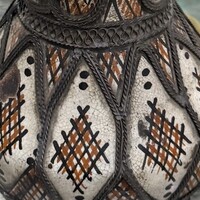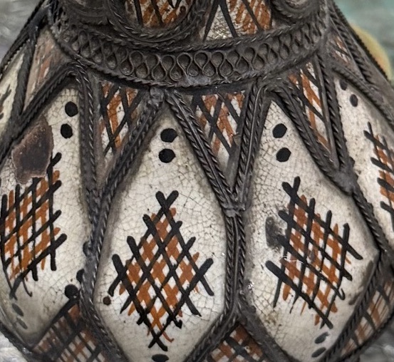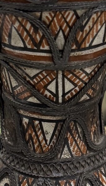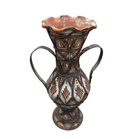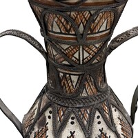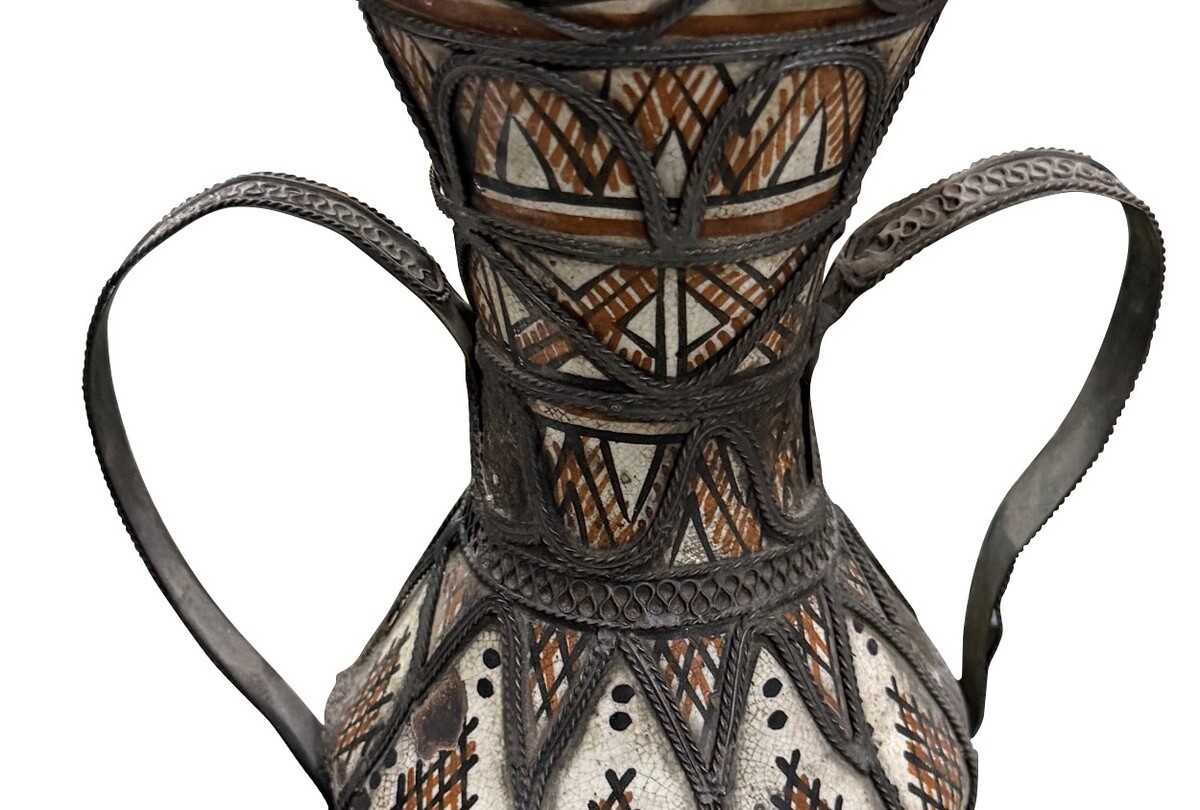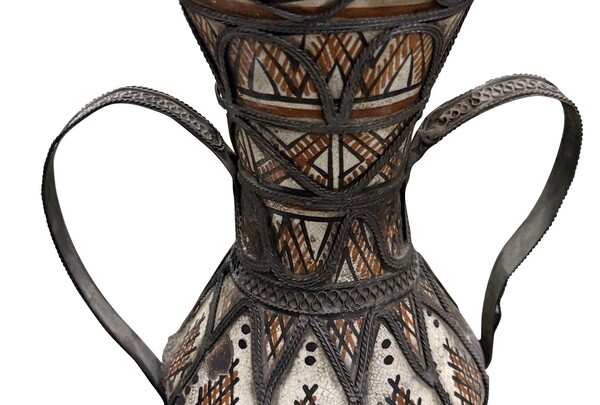 Home Vases 19thc Morocco Two Handle Painted Pieced Vase 19thc Morocco Two Handle Painted Pieced Vase 19thc Morocco two handle vase with detailed bronze strips Pieces painted with hashtag design Fluted opening From the Atlas mountain region Part of a large collection ARRIVING TBD Style Number: S7119 Condition: Excellent for age Origin: Morocco Date: 19thc List: $1800 Inquire About This Piece View PDF Tear Sheet