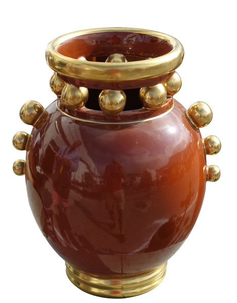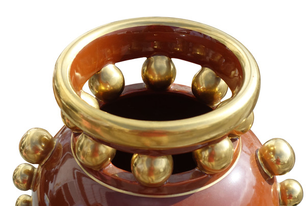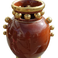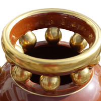 Home Vases Mid Century French Rust and Gold Vase Mid Century French Rust and Gold Vase Rust colored vase with decorative gold leaf balls Lip and base also gold leaf Style Number: S4872 Condition: Excellent Origin: France Date: Mid Century Height: 13" Diameter: 10" List: $995 Inquire About This Piece View PDF Tear Sheet