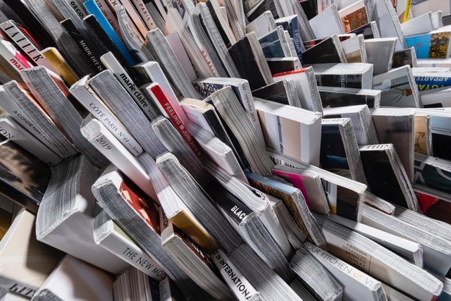Cut pieces of hand folded colored pages from various international magazines folded and placed to create
