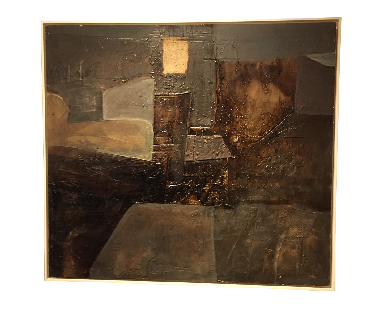 This large painting is created in oil and stucco in shades of dark browns , grey, and gold. The stucco and a combination of matte and gloss paint finish create an interesting textural effect.