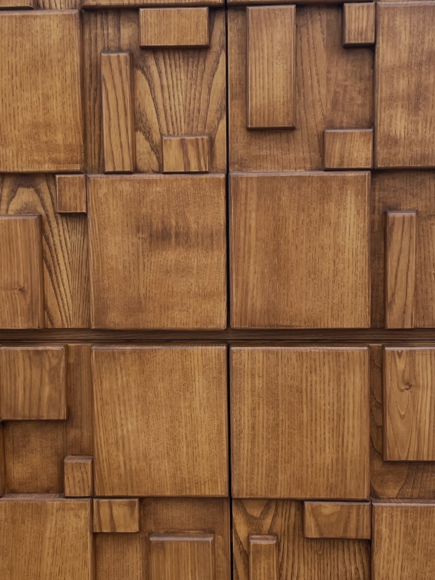 Home Cabinets 1980's Italian Brutalist Four Door Cabinet 1980's Italian Brutalist Four Door Cabinet 1980's Italian Brutalist design four door cabinetP Pronounced raised geometric shapes form classic Brutalist design Oak wood Two inner shelves Pull out hidden shelf makes for a desk top ledge Style Number: F3073 Condition: Excellent for age Origin: Italy Date: 1980's Height: 56" Width: 44" Depth: 17" List: $14950 Inquire About This Piece View PDF Tear Sheet