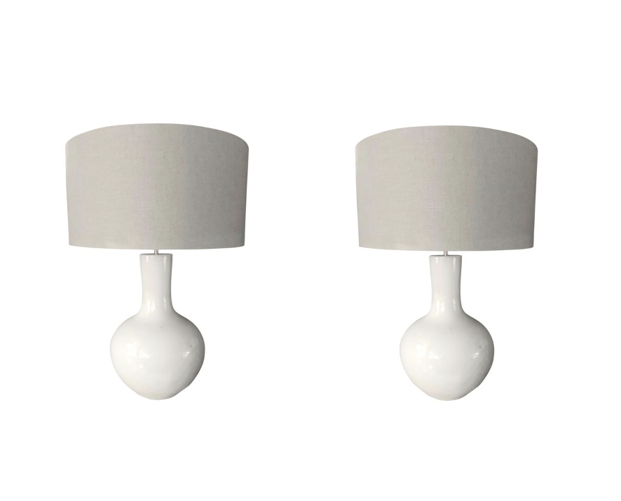 Home Lamps Contemporary Chinese Pair White Long Tube Neck Lamp Contemporary Chinese Pair White Long Tube Neck Lamp Contemporary Chinese white long tube length neck lamp with rounded base Base measures 9.5" diameter and 16" tall Shade diameter is 16" Overall height of the lamps 24" New Belgian linen shade Style Number: L1186 Condition: Excellent Origin: China Date: 21st Century List: $3950 / pair Inquire About This Piece View PDF Tear Sheet