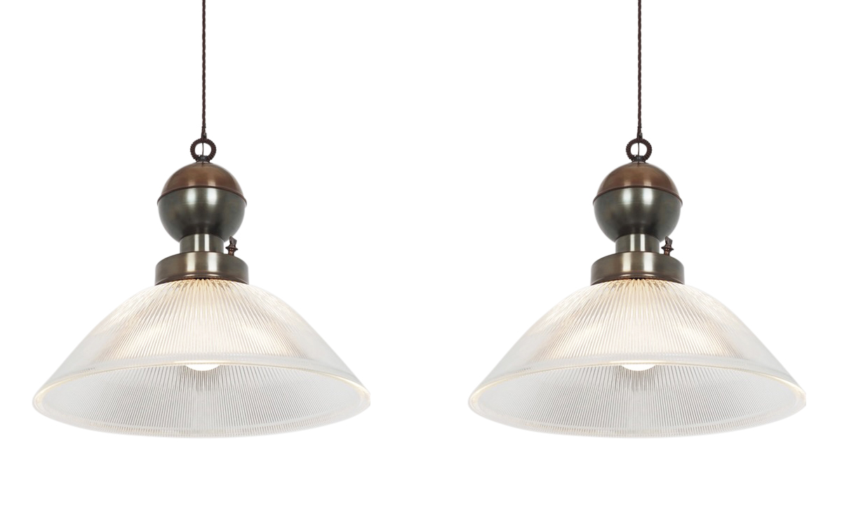 Home Pendants Contemporary Italian Pair Ridged Glass Shade Pendants Contemporary Italian Pair Ridged Glass Shade Pendants Contemporary Italian pair of ridged glass shade pendants Holophane glass Patinated brass/copper 120 watt max Arrival 2-3 weeks upon order confirmation. Style Number: L1126 Condition: Excellent Origin: Italy Date: 21st Century Height: 19" Diameter: 21" List: $6650 pair Inquire About This Piece View PDF Tear Sheet
