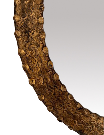 Home Mirrors 1950's Spanish Round Gold GIlt Mirror with Faux Leather Strap 1950's Spanish Round Gold GIlt Mirror with Faux Leather Strap 1950's Spanish round gold gilt framed mirror Decorative hammered detailing Suspended by a faux leather strap with gold gilt " button" Style Number: P1398 Condition: Excellent for age Origin: Spain Date: 1950's Height: 34" Diameter: 25" Depth: 1" List: $6950 Inquire About This Piece View PDF Tear Sheet