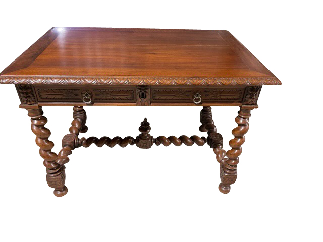 Home Desks & Bars 19thc French Barley Twist Desk 19thc French Barley Twist Desk 19thc French barley twist legs desk Center drawer Decorative finial at cross stretcher local Brass pulls Can also be used as a side table Walnut Style Number: F3018 Condition: Excellent for age Origin: France Date: 19thc Height: 29.5" Width: 43" Depth: 29.5" List: $8950 Inquire About This Piece View PDF Tear Sheet