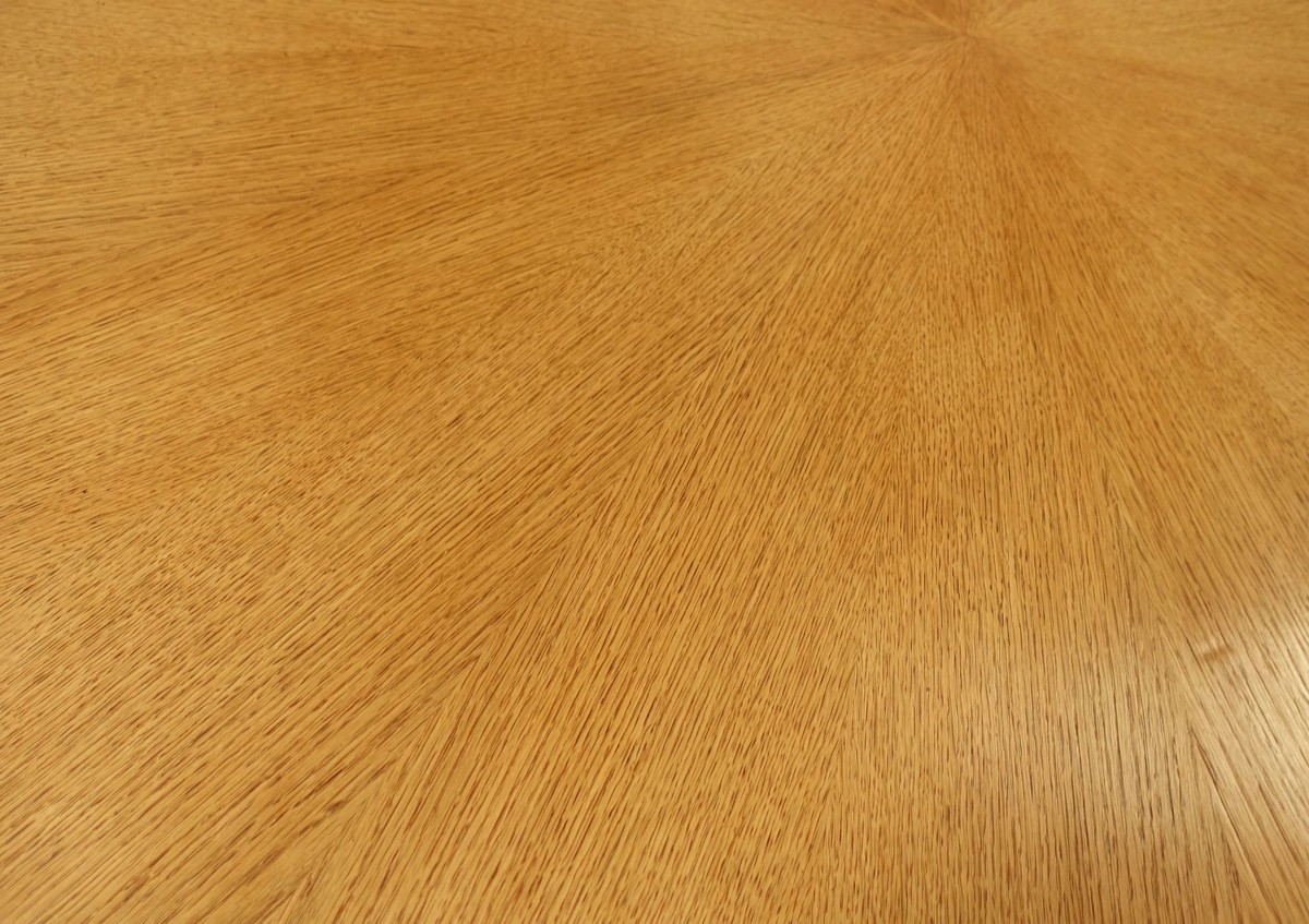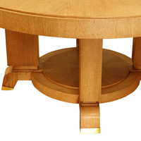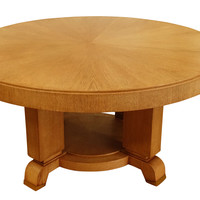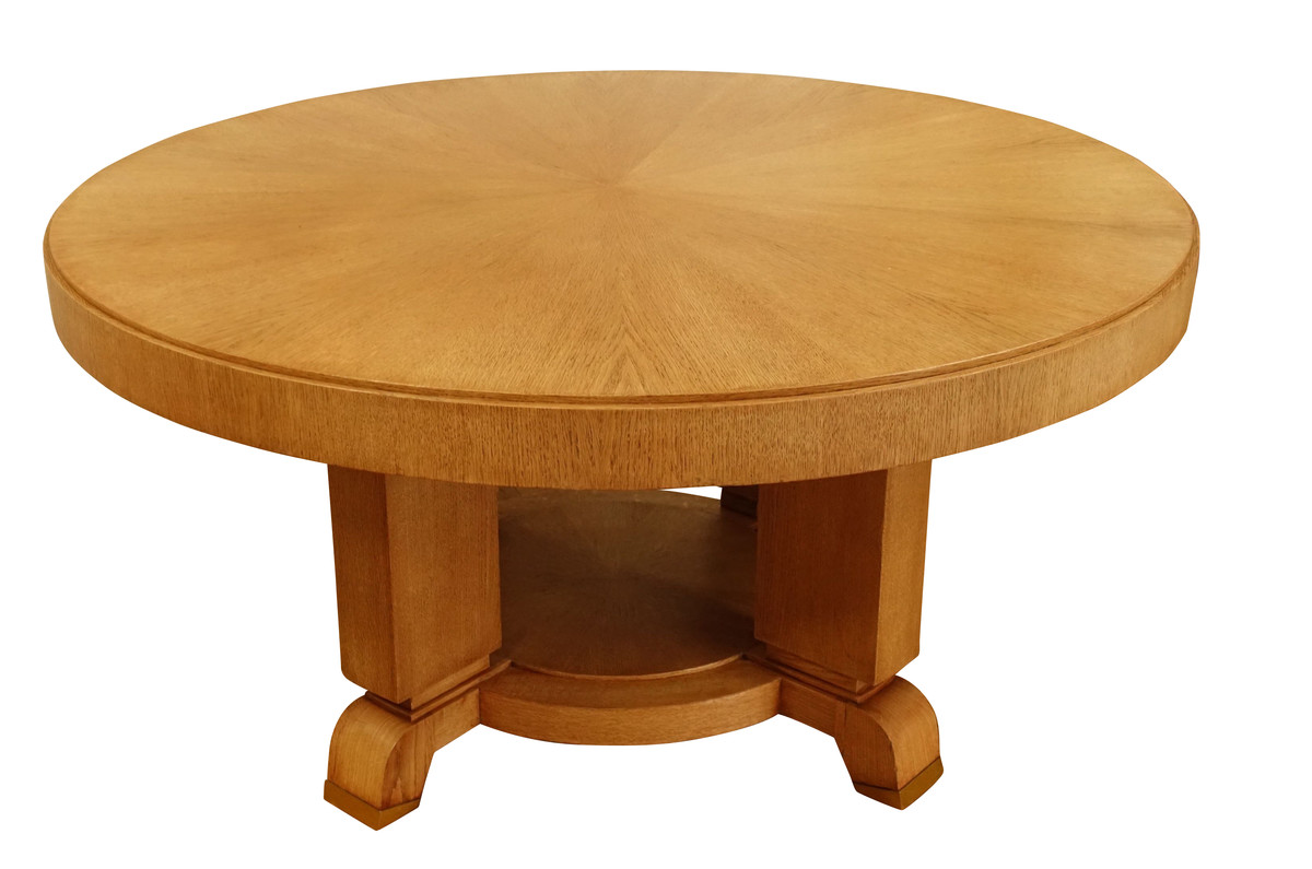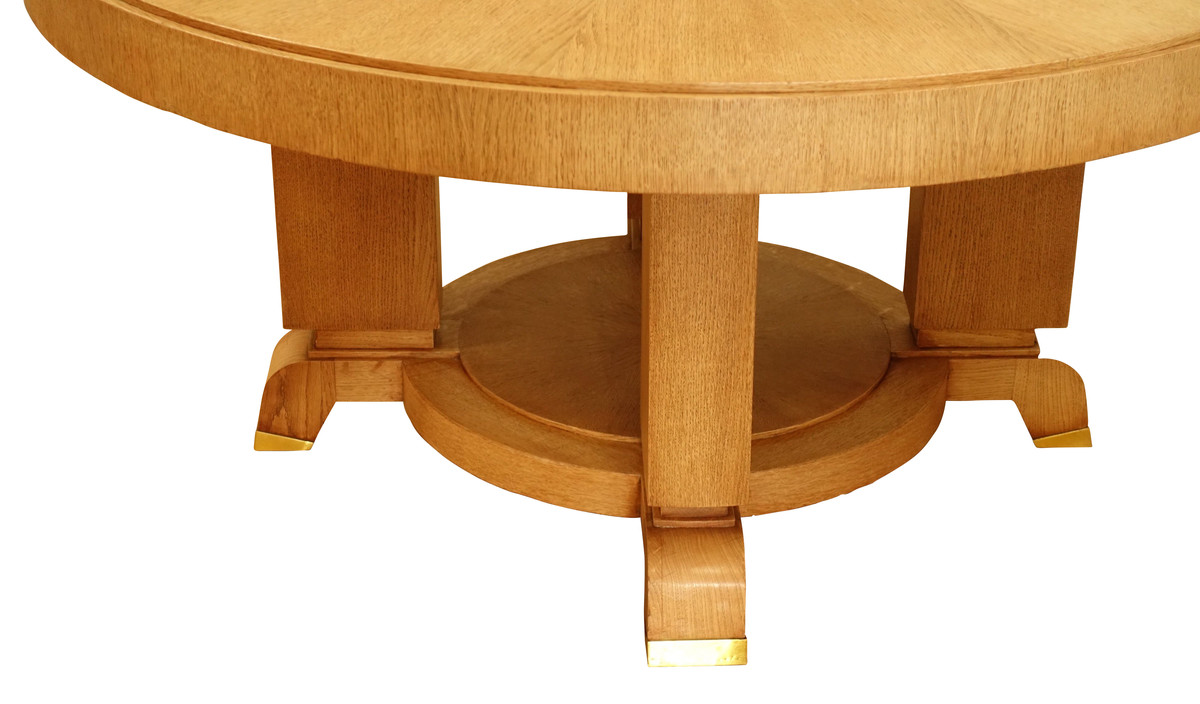 Home Dining 1940's French Jules Leleu Round Dining Table 1940's French Jules Leleu Round Dining Table Jules Leleu round mitered oak top dining table Thick apron Very sculptural Four legs with brass sabot footing ARRIVES EARLY DECEMBER Style Number: F2553 Condition: Excellent with age Origin: France Date: 1940's Height: 29.5" Diameter: 59" List: $16950 Inquire About This Piece View PDF Tear Sheet