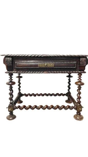 Home End / Side 18thc Portuguese Side Table 18thc Portuguese Side Table 18thc Portuguese side table with two drawers Unusual smaller size makes a great side table Classic decorative trim with ornate brass details Barley twist legs and stretcher Palissandre wood Style Number: F3043 Condition: Excellent for age Origin: Portugal Date: 18thc Height: 19" Width: 24" Depth: 17" List: $5950 Inquire About This Piece View PDF Tear Sheet